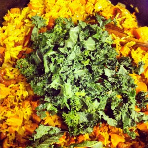Ajouter le chou frisé et la chair de saucisse et couvrir