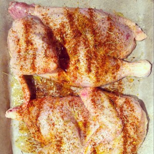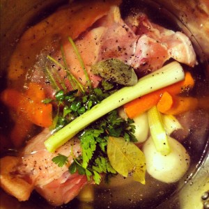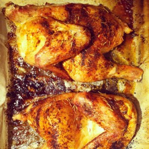 Pendant que le bouillon mijote (environ 45 minutes de cuisson), je prépare mon poulet à rôtir. Je choisis un poulet moyen bio que je coupe en deux et je j’enduits d’huile d’olive, de sel et poivre, paprika et romarin. Je le mets au four à 425 F pendant 35 minutes environ ou jusqu’à ce que les cuisses se détachent facilement.