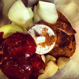 Ensuite, ce qui rend cette soupe si intéressante est son mélange d’épices et d’oignon que l’on réduit en purée, ce qui forme sa base. Avant d’incorporer les épices au robot culinaire, il faut les faire griller à la poêle quelques minutes pour développer leurs essences. Si vous avez les papilles sensibles, réduire les quantités de chipotle et de poivre de Jamaïque !