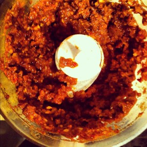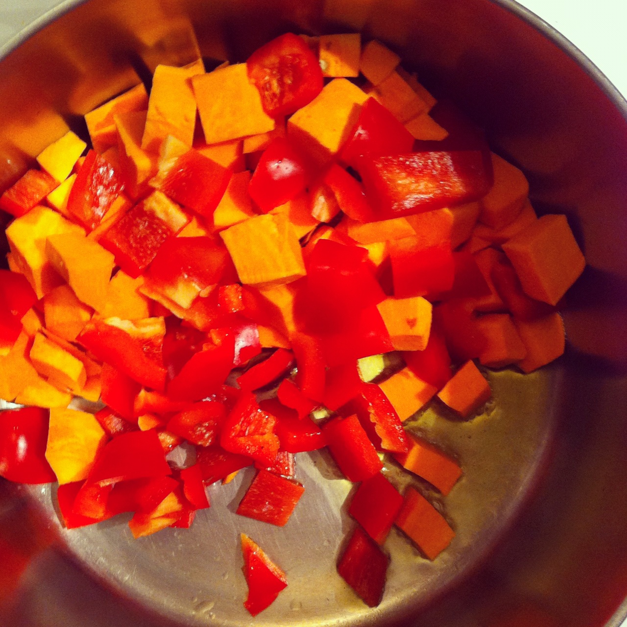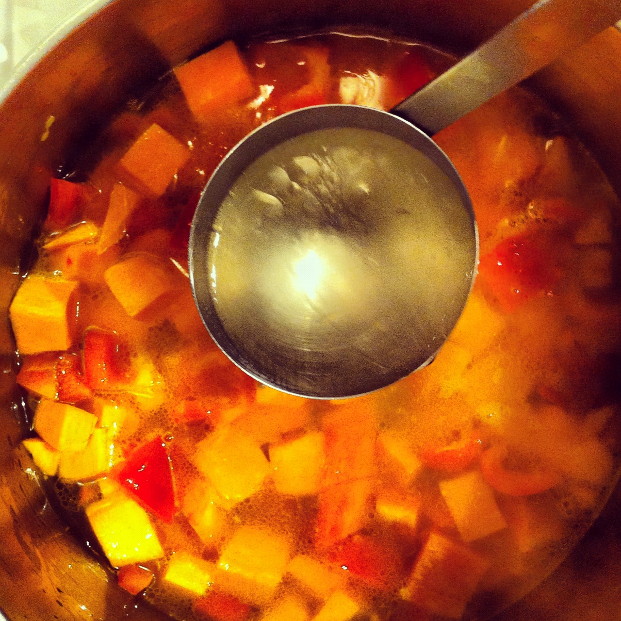 Alors voilà une de mes recettes favorites d’automne à cause de son bouquet exotique, sa consistance riche et de son goût piquant et fumé. C’est un amalgame de recettes que j’ai essayé au fil des ans avec quelques améliorations de mon cru, pour finalement en arriver à cette combinaison d’ingrédients. Ce n’est pas une de ces recettes que l’on entreprend en revenant du travail, mais j’ai tout de même tenté de relever le défi samedi dernier en revenant du marché (vers 18 h) tout en m’imaginant de réaliser toutes les étapes en 5 minutes ! … Mes pauvres invités, ils se sont armés de patience ! C’est d’ailleurs l’expression favorite de mon amie Lisa en cuisine : « Ça prend juste 5 min ! C’est facile ! » Mais vous savez comme moi que ça ne s’applique malheureusement pas à toutes les recettes. Cependant, pour cette soupe il est possible d’utiliser un bouillon préparé d’avance et un restant de poulet rôti pour sauter quelques étapes et ainsi réduire le temps de préparation. Lisa pourra dire ensuite que ça prend juste 5 minutes pour la réaliser !