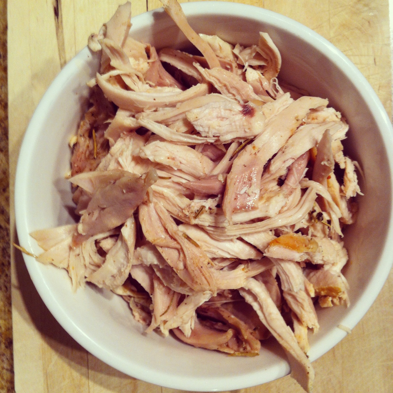 Pendant ce temps, je dépèce une moitié du poulet rôti (ce qui donne environ 1 1/2 de chair), pour l’incorporer à la mi-cuisson.
