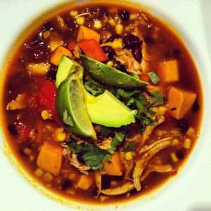 Dans une marmite, je fais sauter le poivron et la patate douce dans un peu d’huile d’olive et ensuite j’y incorpore le bouillon de poulet. J’y ajoute la purée d’épices, les fèves noires, le maïs, la tomate en conserve et le riz brun et je fais mijoter le tout pendant environ 45 minutes ou jusqu’à ce que la patate douce et le riz soient tendres. Parfois, j’ajoute un peu de bouillon vers la fin de cuisson, si la soupe a trop réduit. Cependant, la consistance de cette soupe devrait ressembler davantage à un ragoût qu’à une soupe liquide.