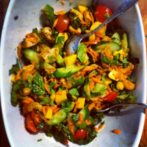 Ajoutez les fines herbes, les noix d’acajou et la vinaigrette