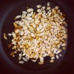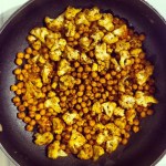 À feu vif, dans un poêlon, faire griller les fleurets de chou-fleur et les pois chiches pelés dans 2 c. à soupe d’huile d’olive pendant environ 5 minutes, toujours en remuant. Une fois que la coloration est égale de tous les côtés, ajouter les épices (cari doux, paprika et curcuma), réduire le feu et faire revenir pendant 5 minutes. Assaisonner et retirer et du feu.