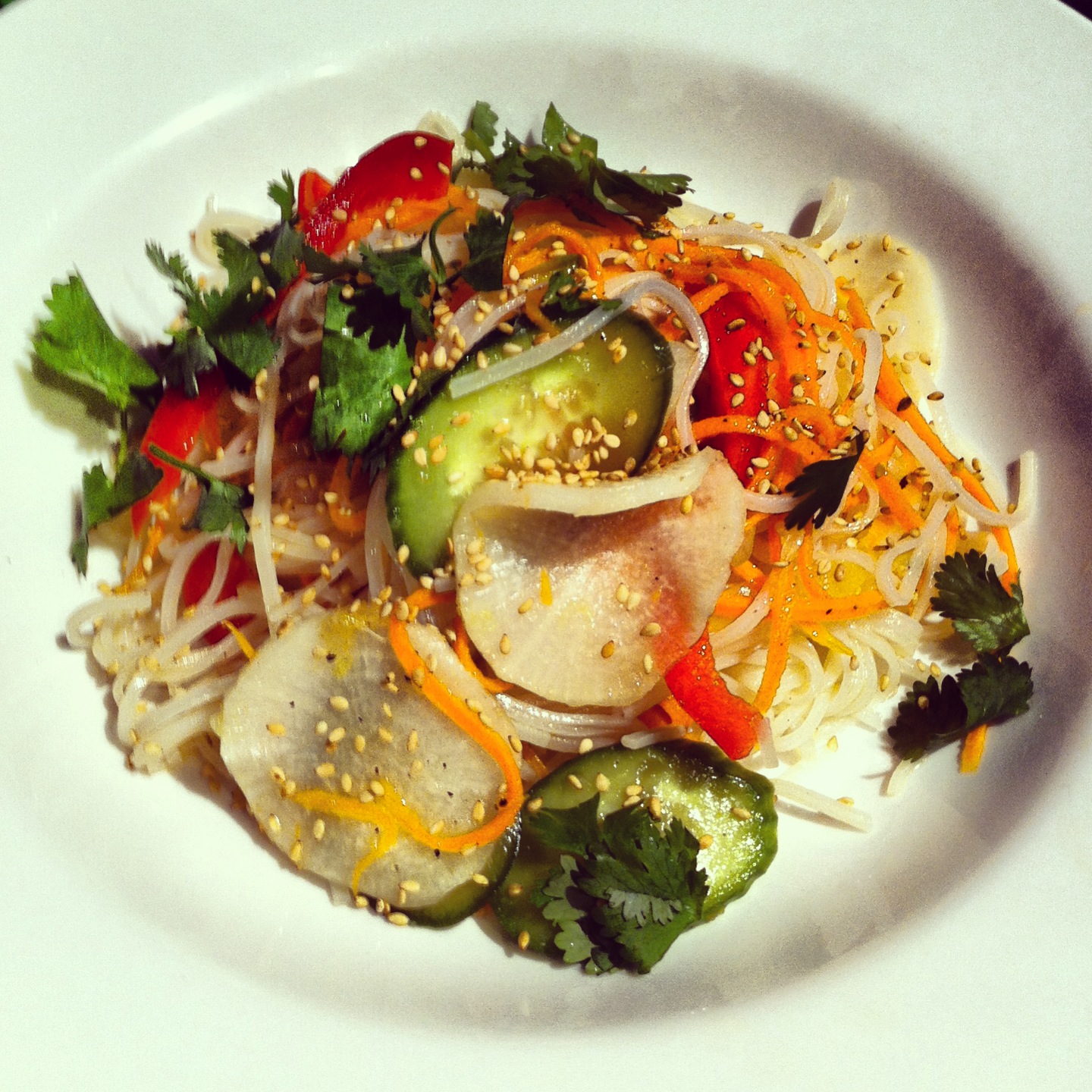 Dans un grand bol, placer les nouilles de riz et les recouvrir avec de l’eau bouillante. La cuisson devrait prendre environ 15 minutes. Ensuite, rincer les nouilles à l’eau froide pour arrêter la cuisson et empêcher qu’elles ne collent. Dans un moyen bol, incorporer les ingrédients de la marinade et mélanger jusqu’à ce que le sucre soit fondu. Ajouter à la marinade le daïkon, les concombres et carottes en juliennes et bien mélanger. Laisser reposer 15-20 minutes. Dans un grand bol, mélanger les nouilles de riz avec l’huile d’olive, la coriandre, la menthe et les oignons verts. Ajouter ensuite les lanières de poivron rouge et les graines de sésame. Incorporer les légumes marinés ainsi que la marinade aux nouilles et servir.