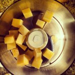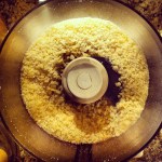 Ensuite, mettre le parmesan en cube dans le robot culinaire et pulser jusqu’à ce le fromage soit grossièrement granuleux. Je préfère procéder ainsi plutôt que de le râper, car on conserve des petits morceaux de parmesan dans le pesto. Retirer le parmesan du robot et réserver la quantité nécessaire pour la recette.